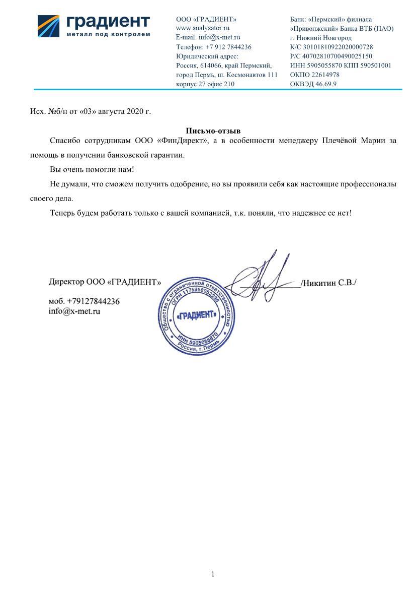Хотим выразить благодарность сотрудникам компании ООО"Фин-Директ", которые всегда помогают получать нам банковские гарантии.
